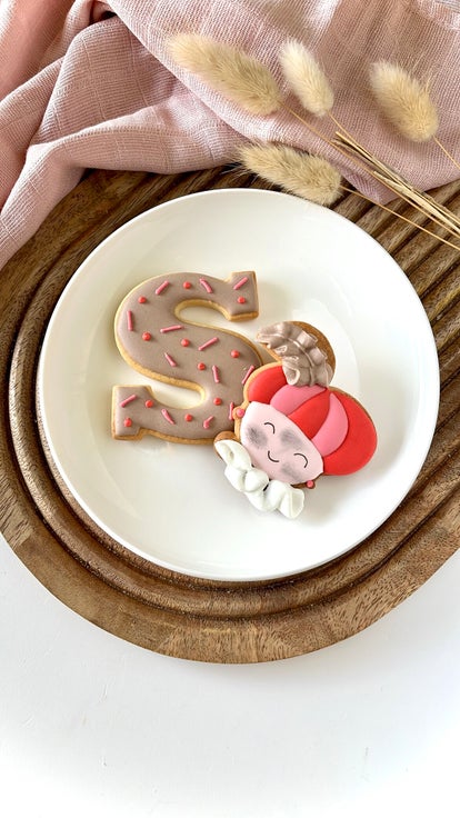 Heerlijke vanille koekjes hand gedecoreerd met royal icing. De set bestaat uit een Pietje en een letter naar keuze. Leuk als schoencadeautje! Je letter(s) kun je aangeven in het opmerkingen veld.