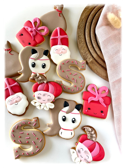 Heerlijke vanille koekjes hand gedecoreerd met royal icing. De set bestaat uit 6 koekjes (Sint, Piet, Ozosnel, zak, cadeautje, letter)